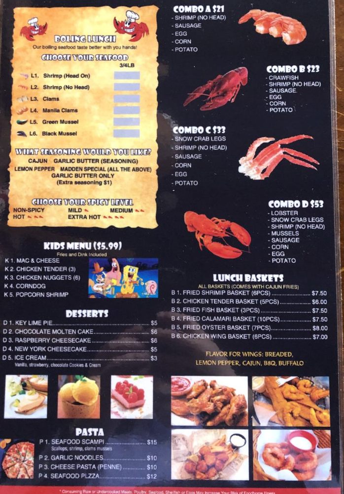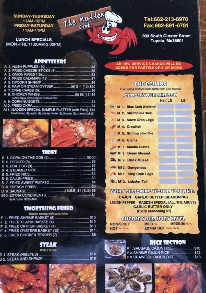 Introducing The Madden Crab, a seafood haven located in Tupelo, MS, offering a variety of options for all preferences. With a menu brimming with vegetarian choices, including favorites like Hush Puppies and Fried Cheese Sticks, this establishment has something for everyone. The lunch baskets feature delectable options like Fried Shrimp and Chicken Tenders, while the Combo offerings, such as Combo A and Combo B, showcase a mix of shrimp, sausage, corn, and more. Customers rave about the perfectly cooked and seasoned dishes, with compliments on the generous portions and quality seafood. Despite minor gripes about utensils, the overall experience is highly recommended. Don't miss out on trying out the steamed rice with your boil bag for a complete dining experience at The Madden Crab.
